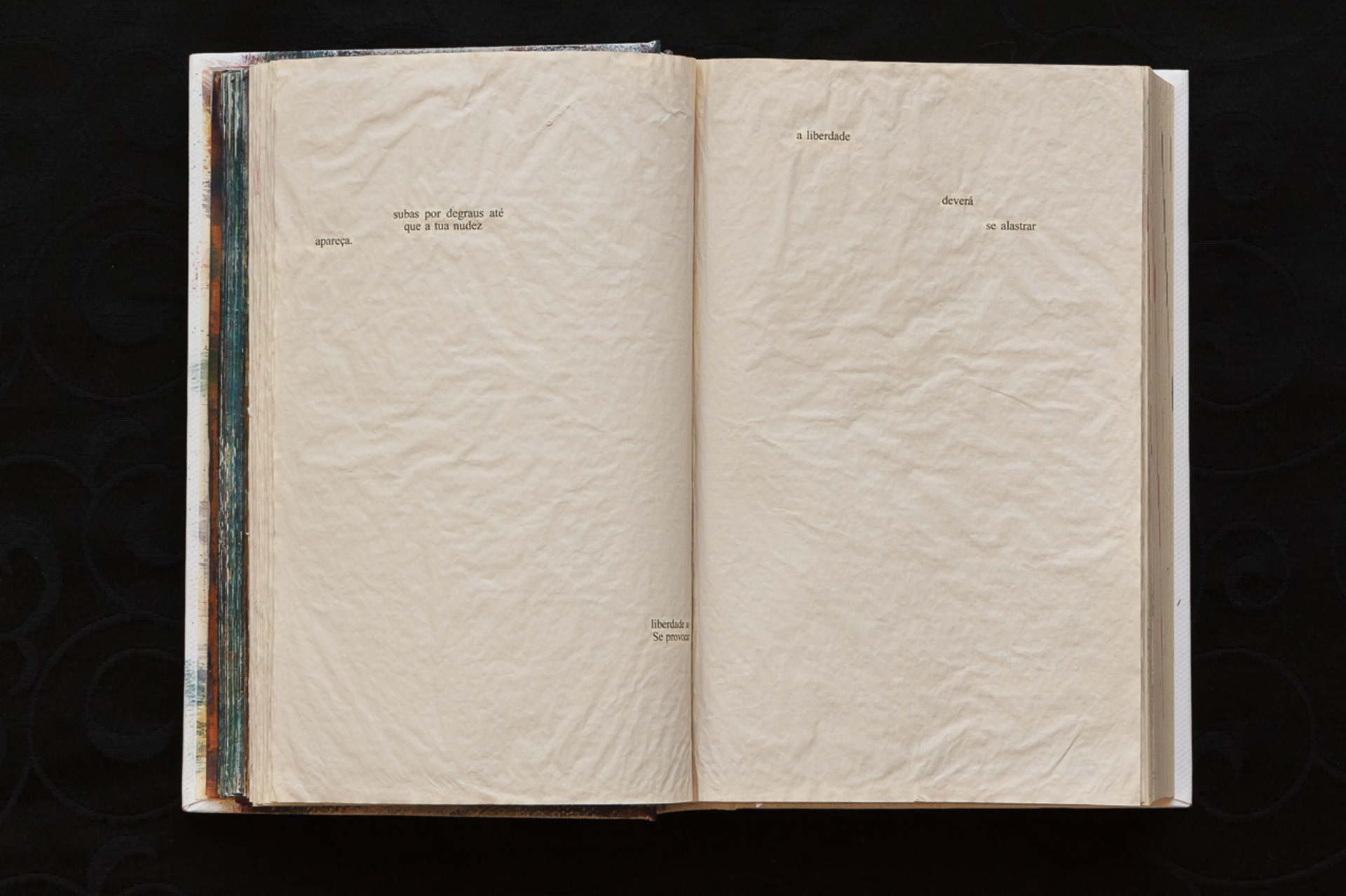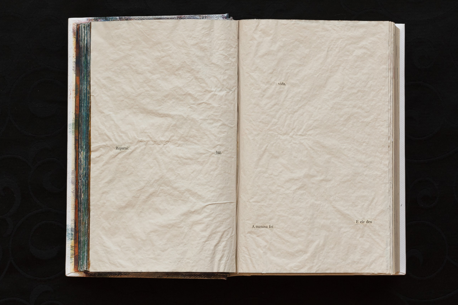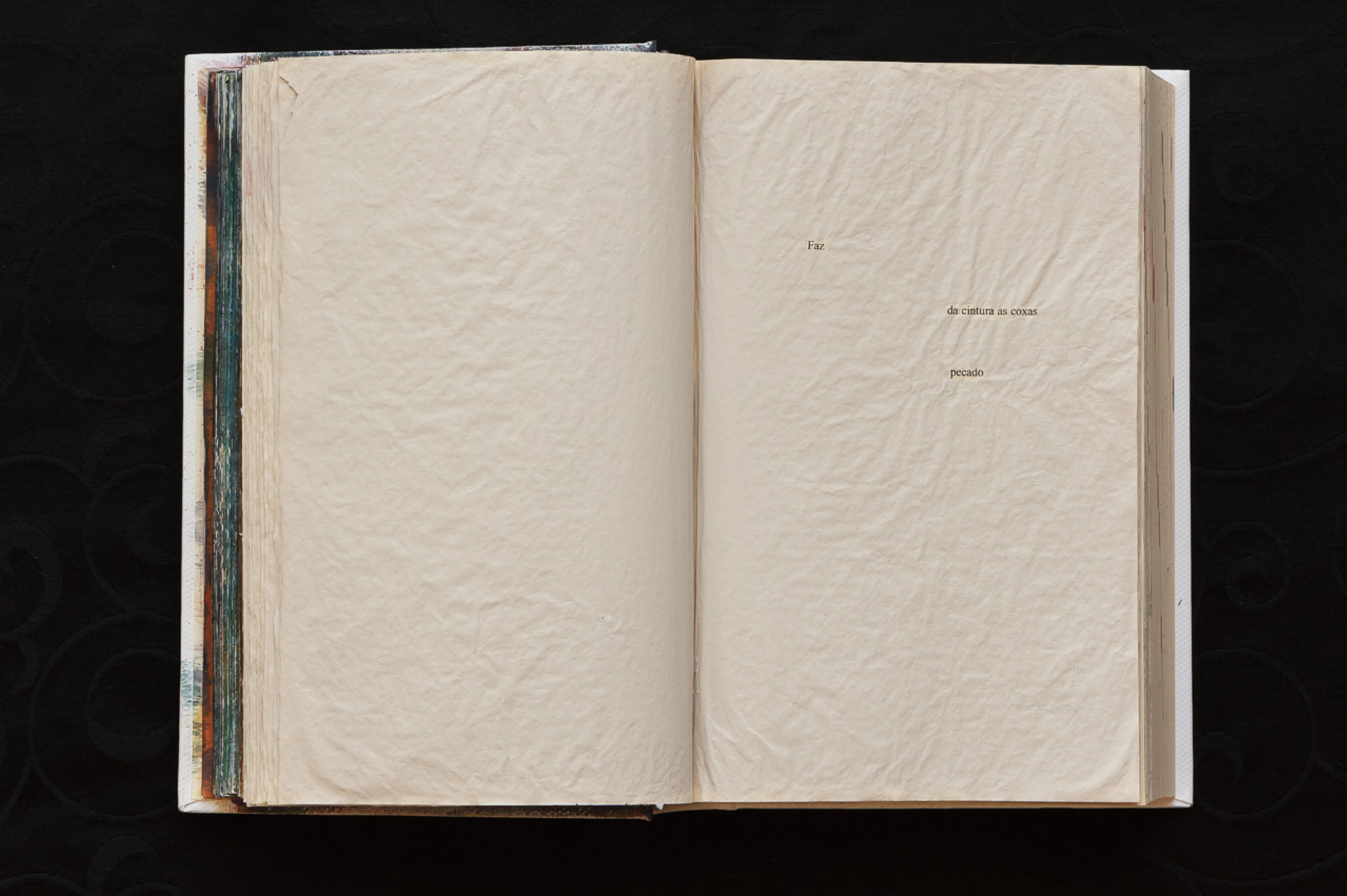 (PT) O livro Êxodo foi aqui alterado drasticamente através da interferências de tinta acrílica de cor similar ao do papel original do livro, oferecendo a sensação de total apagamento das palavras jaz impressas ali. O Contexto leva a criação de uma história cíclica que se deita sobre os temas do prazer carnal, libertação e amor. A história é apresentada segundo uma análise ética, ou seja, sem buscar julgamentos comportamentais e, tampouco, qualquer ligação com o texto "original". Tudo o que é contado é narrado segundo a interpretação humana: as palavras foram elencadas de acordo com o desejo da autora/artista para provocar questionamentos à respeito da própria construção dos textos bíblicos "originais" do velho testamento bíblico.